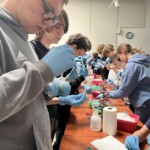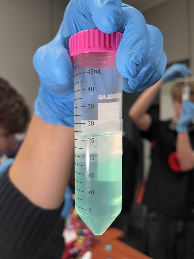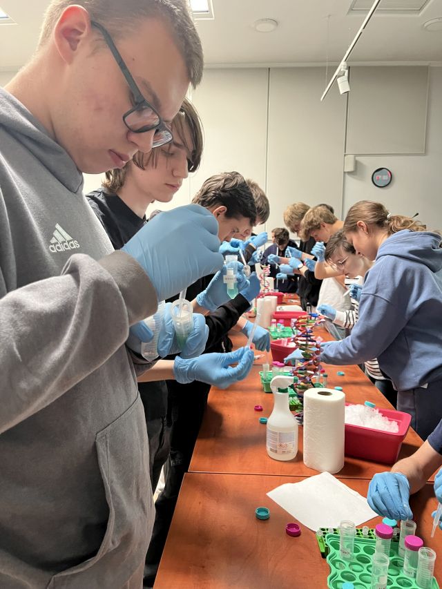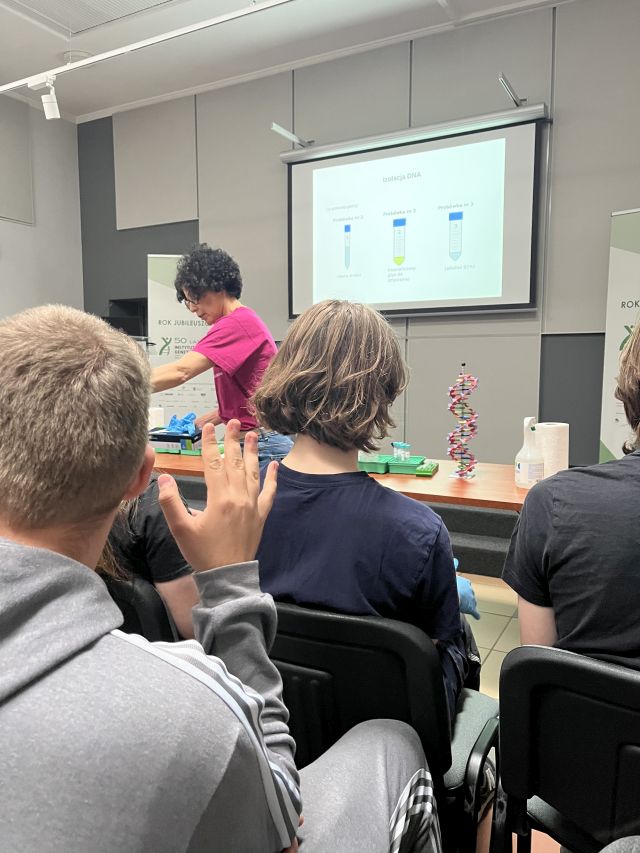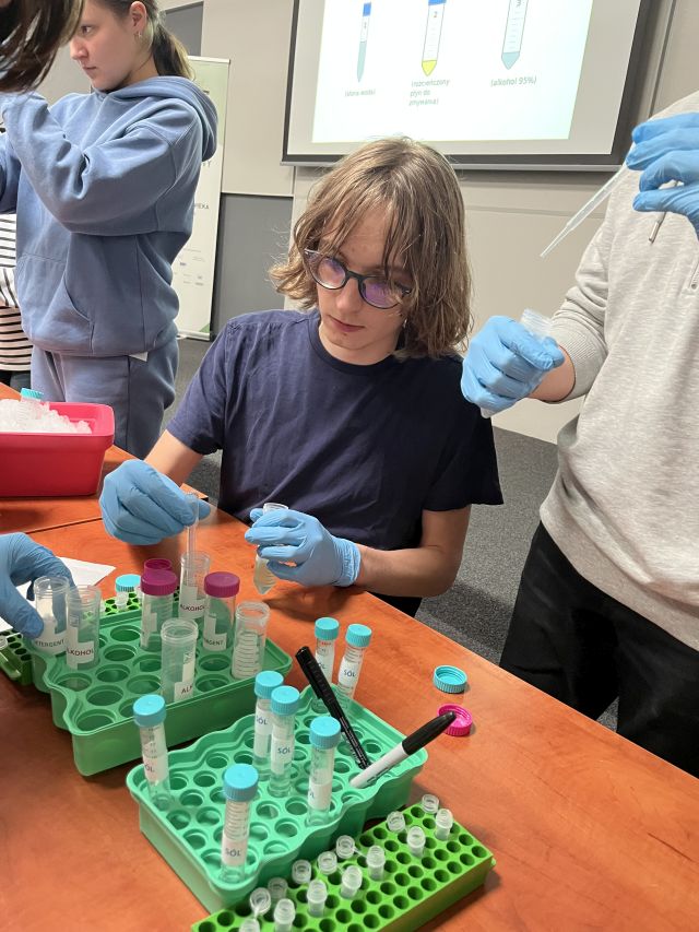 Następnie uczniowie wzięli udział w zajęciach praktycznych, podczas których samodzielnie izolowali DNA z komórek nabłonka jamy ustnej. Prosty, ale efektowny eksperyment pozwolił każdemu dosłownie „zobaczyć cząstkę siebie” i zrozumieć, jak z pozoru niewidzialna informacja genetyczna może zostać uchwycona i wykorzystana w badaniach.
