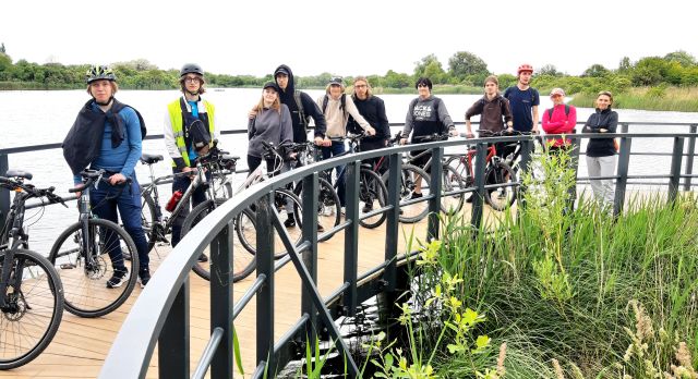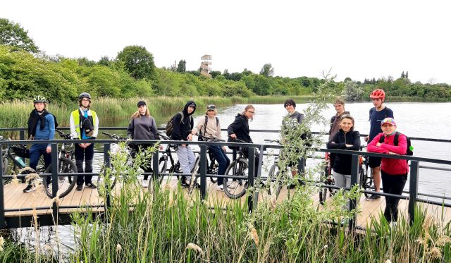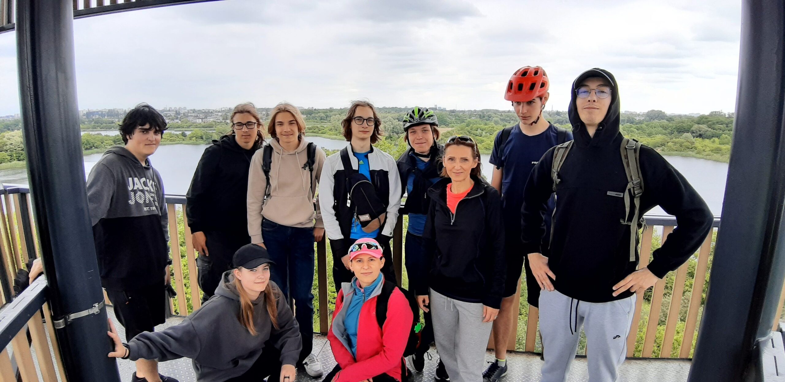 Najpierw dotarliśmy na Szachty. Jest to obszar o wyjątkowym charakterze z kompleksem stawów, łąk i lasów. Wytyczono tu liczne ścieżki i alejki, tworząc bardzo spokojną i otoczoną bujną przyrodą przestrzeń rekreacyjną. Centralnym punktem tej części wyprawy było wejście na 25-metrową wieżę widokową, na której szczyt prowadzi 120 stopni. To doskonały punkt obserwacyjny, skąd podziwialiśmy zarówno miejską panoramę, jak i dziką przyrodę.