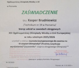 Z przyjemnością informujemy, że Kasper Brudniewicz, uczeń naszego technikum z powodzeniem uczestniczył w etapie okręgowym XIII Ogólnopolskiej Olimpiady Wiedzy o Unii Europejskiej, zdobywając wyróżnienie oraz tytuł uczestnika stopnia okręgowego.